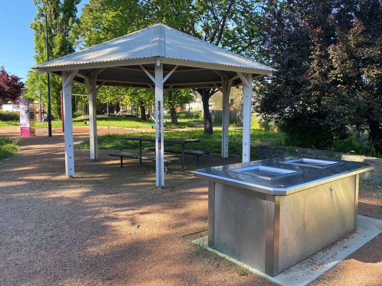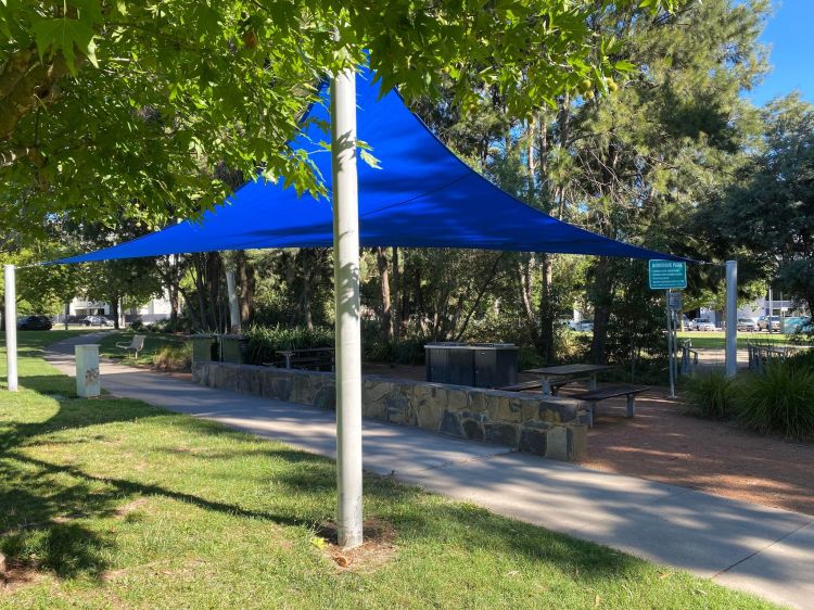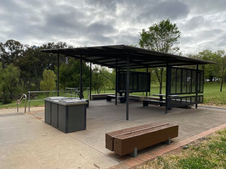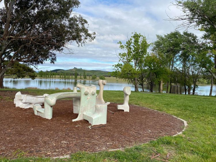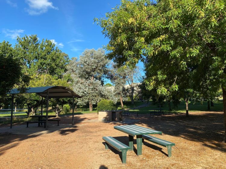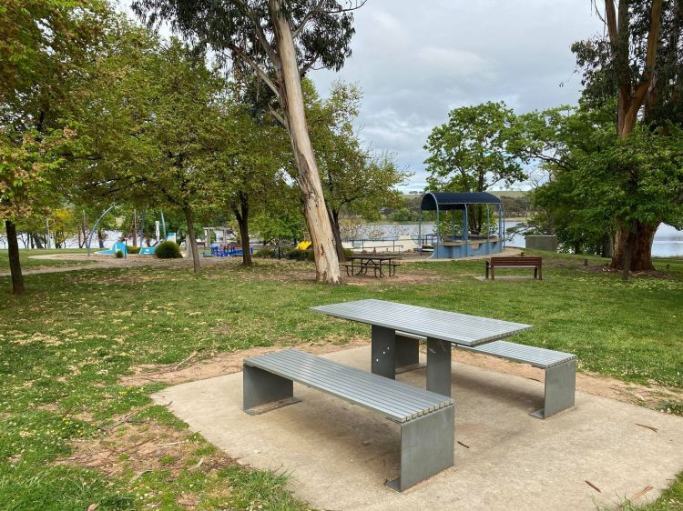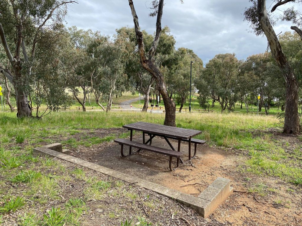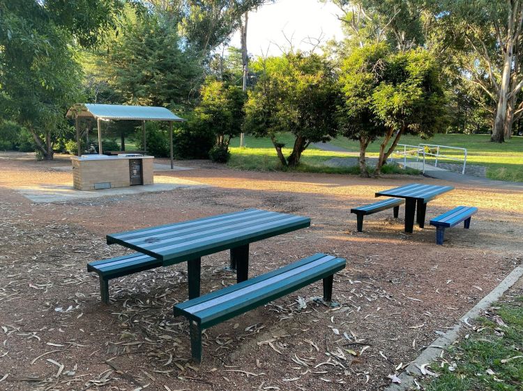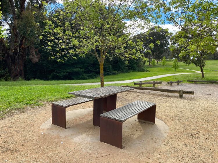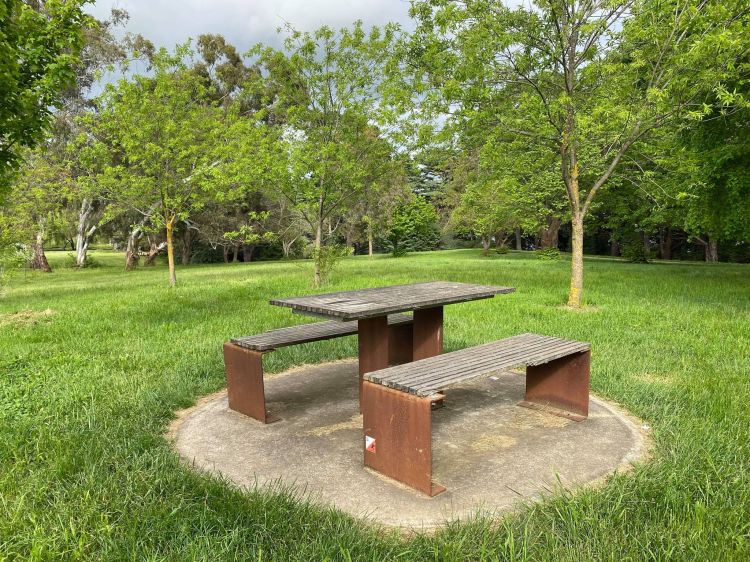 | Picnic Tables – Large Sheltered BBQ Picnic Area with 4 picnic tables, individual seating areas . – 2 picnic tables on grass close to playground/ BBQ Area. – 2 picnic tables on grass closer to Yarralumla Play Station. – 1 picnic table on grass next to pond feature. – 3 under tree shade nearby to pond feature. – 3 nearby David Tolley’s Play Sculptures. |