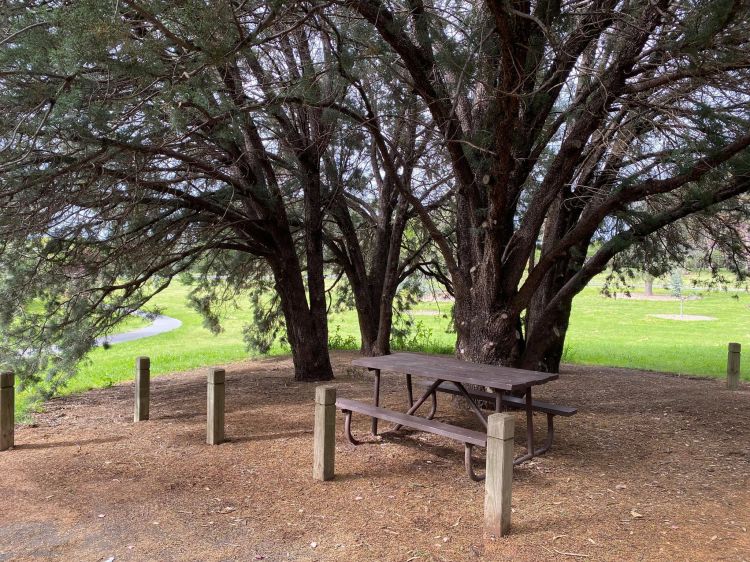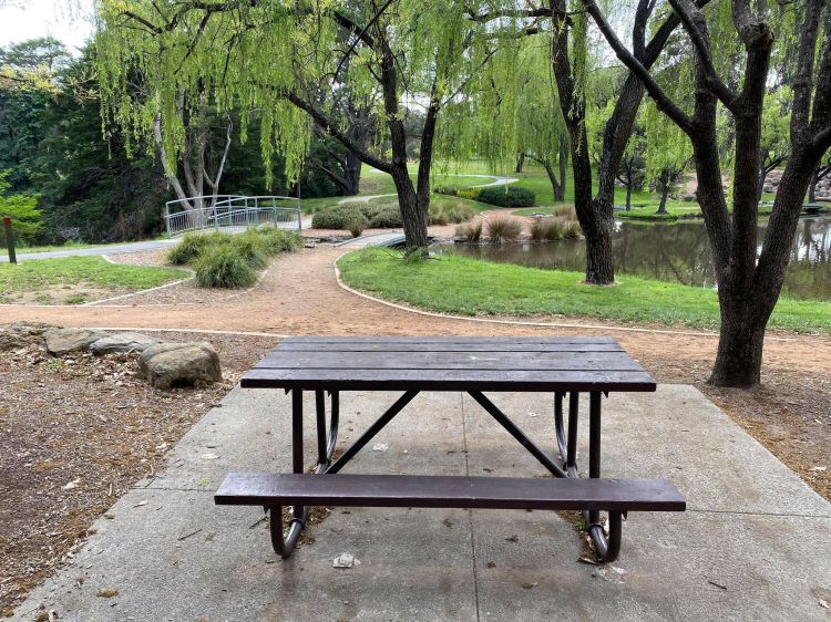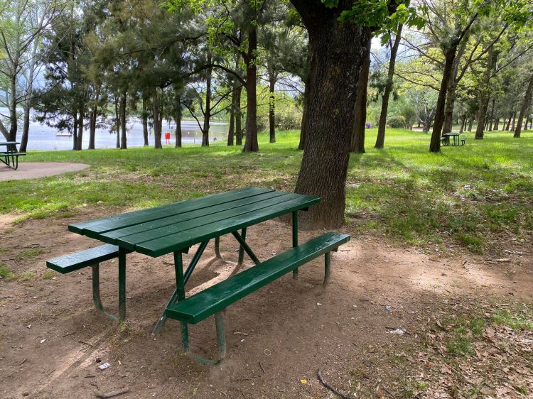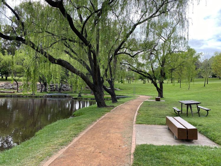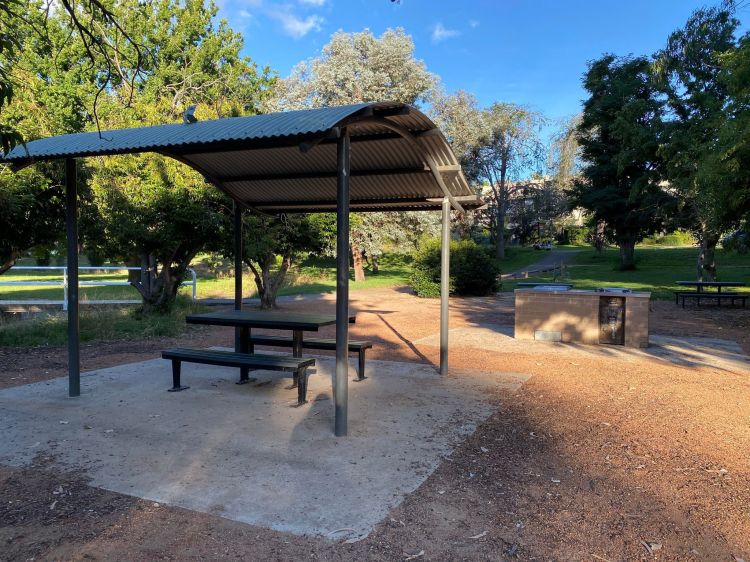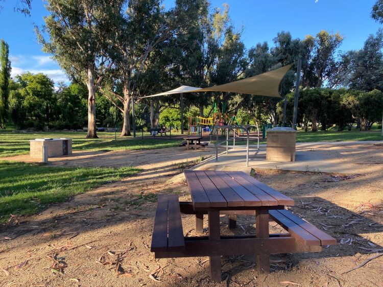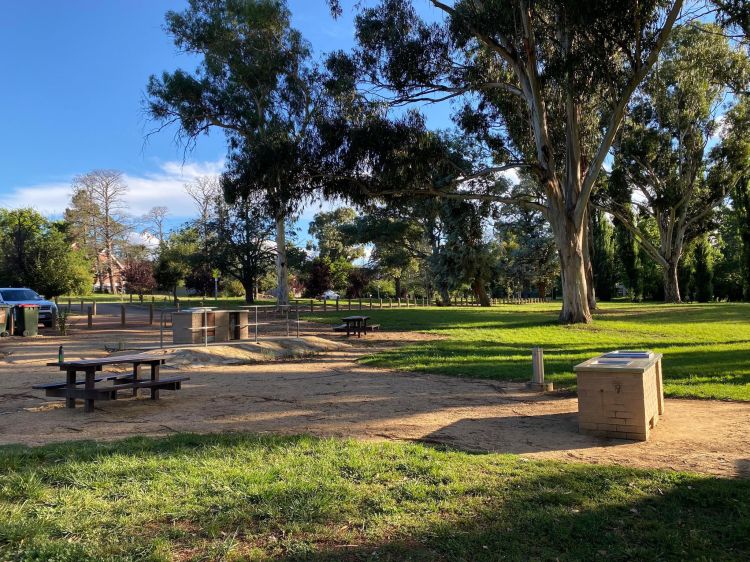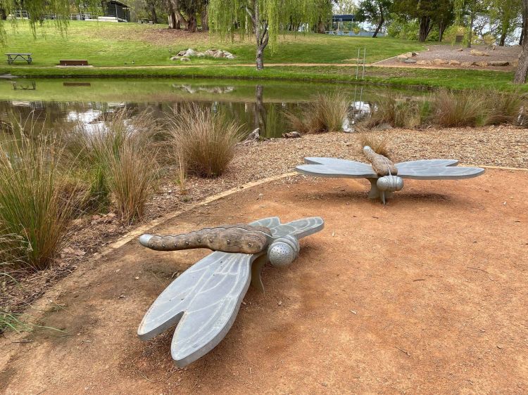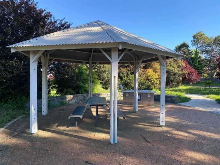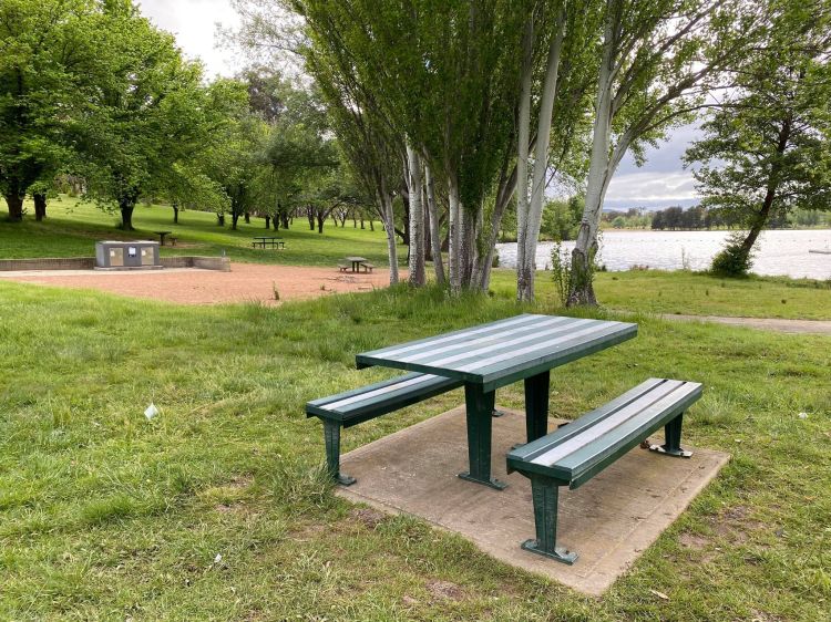 | Picnic Tables – Large Sheltered BBQ Picnic Area with 4 picnic tables, individual seating areas . – 2 picnic tables on grass close to playground/ BBQ Area. – 2 picnic tables on grass closer to Yarralumla Play Station. – 1 picnic table on grass next to pond feature. – 3 under tree shade nearby to pond feature. – 3 nearby David Tolley’s Play Sculptures. |
