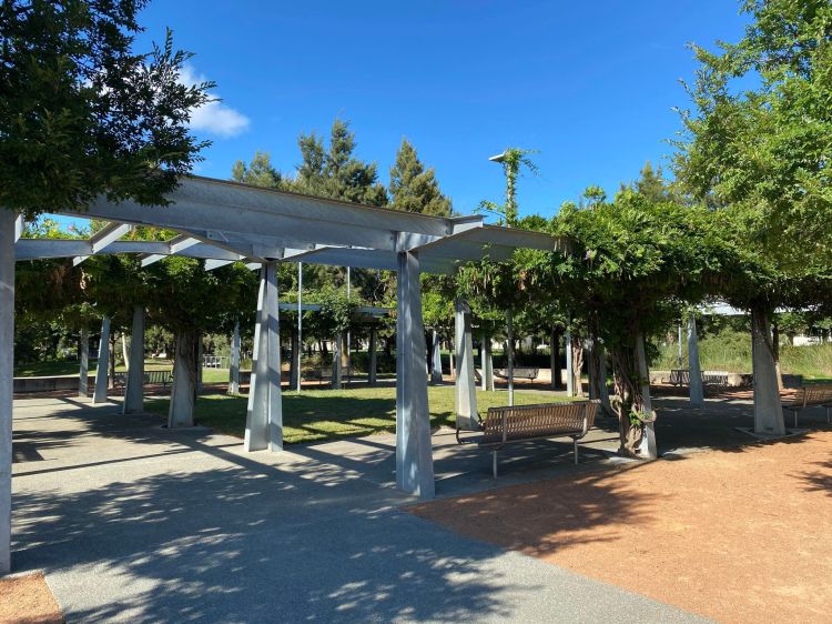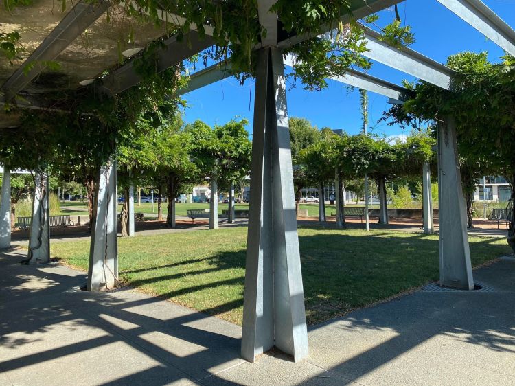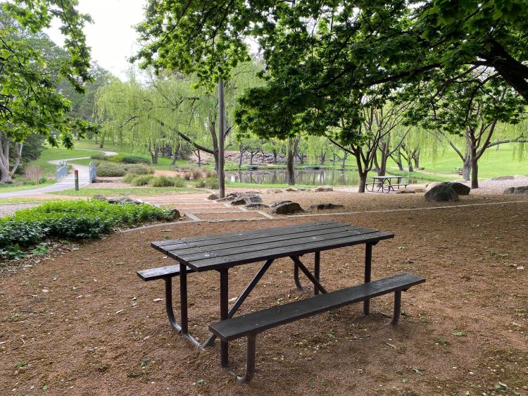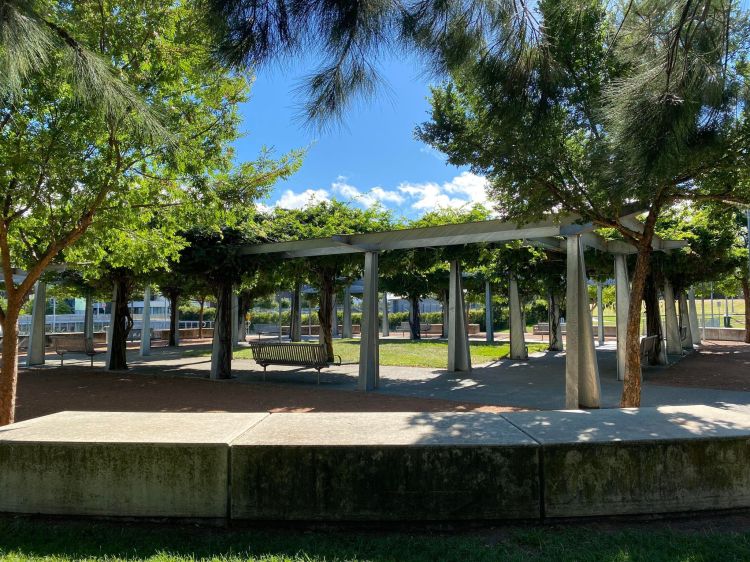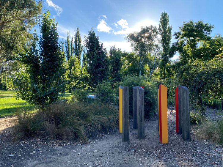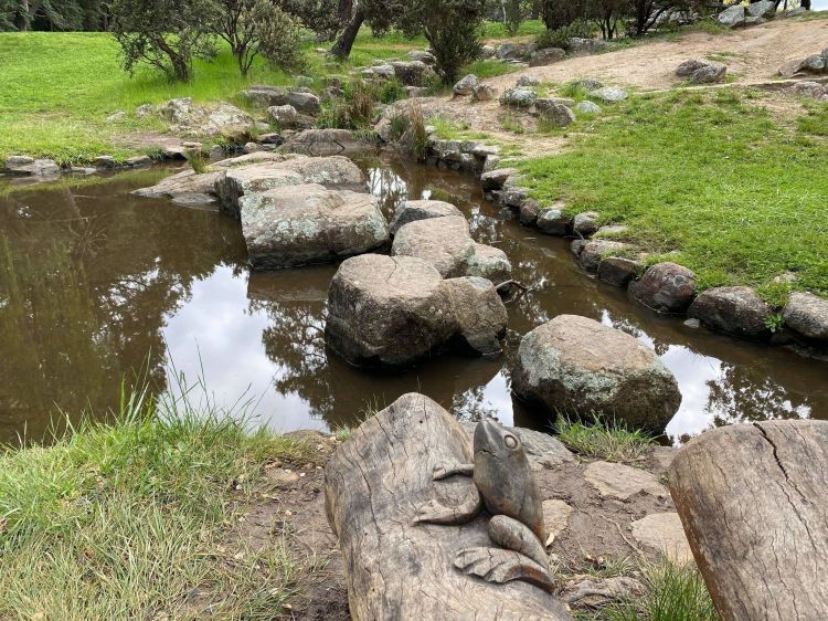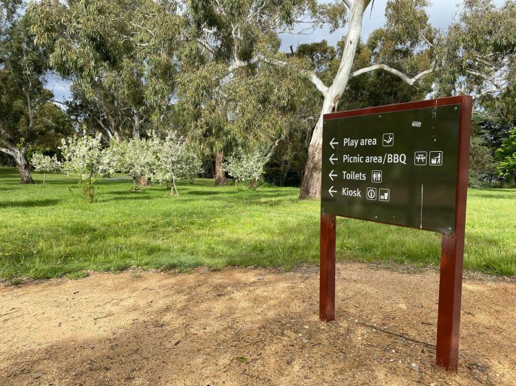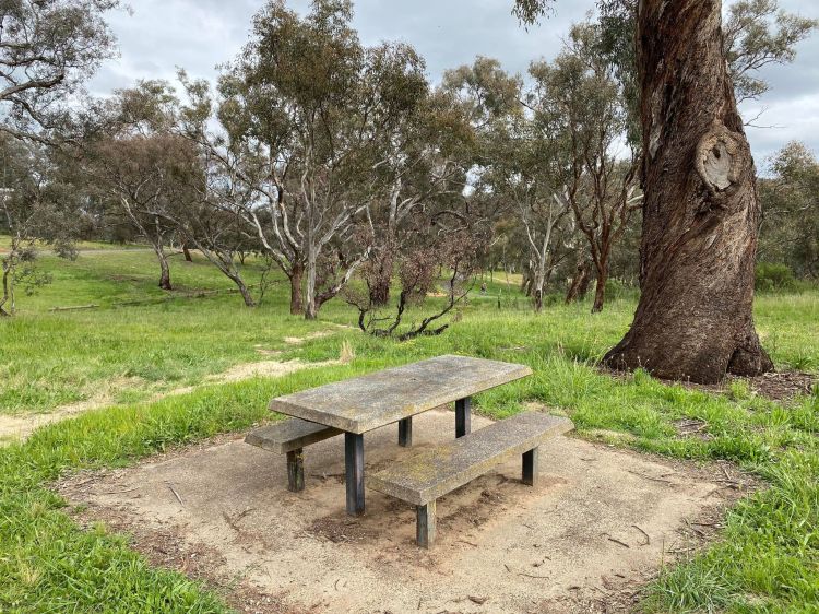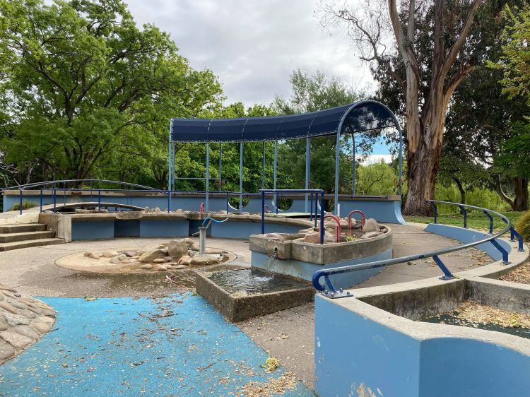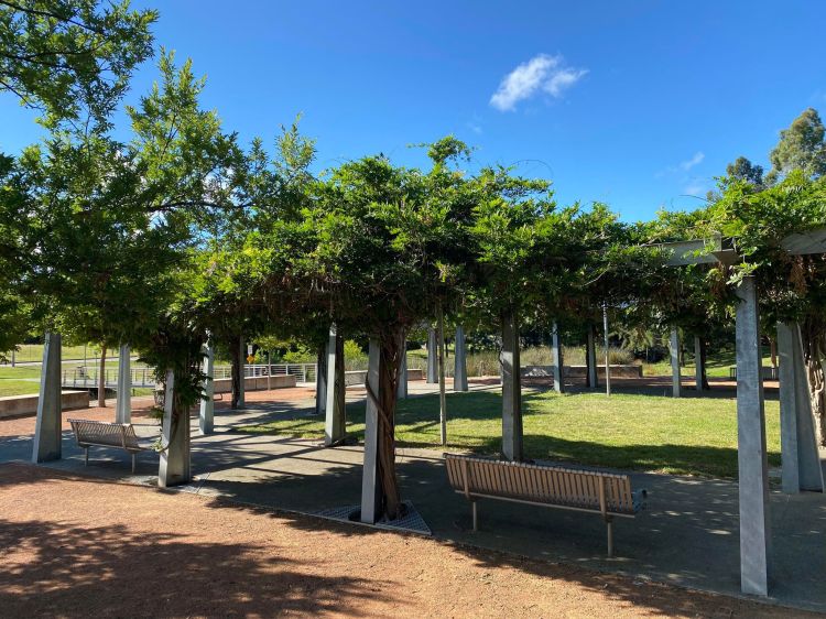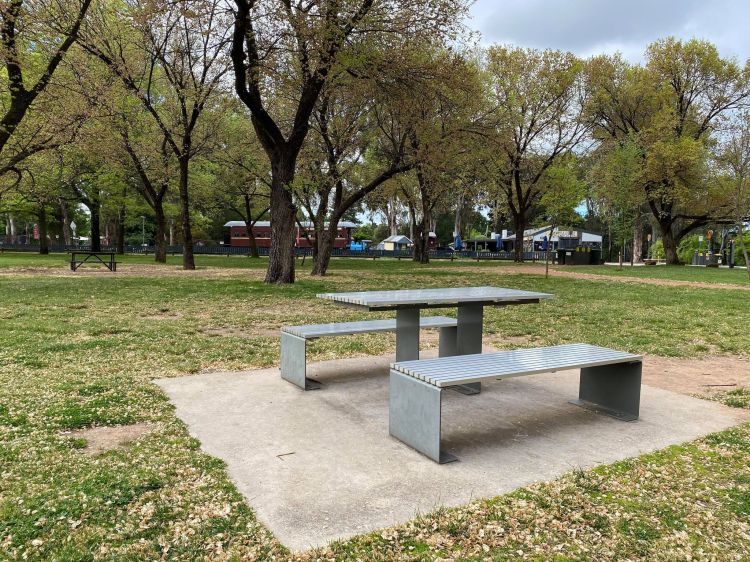 | Picnic Tables – Large Sheltered BBQ Picnic Area with 4 picnic tables, individual seating areas . – 2 picnic tables on grass close to playground/ BBQ Area. – 2 picnic tables on grass closer to Yarralumla Play Station. – 1 picnic table on grass next to pond feature. – 3 under tree shade nearby to pond feature. – 3 nearby David Tolley’s Play Sculptures. |