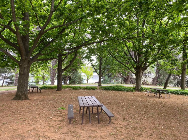 | Picnic Tables – 1 with BBQ474 on concrete and under tree shade. -2 nearby BBQ474 on grass and under tree shade. |